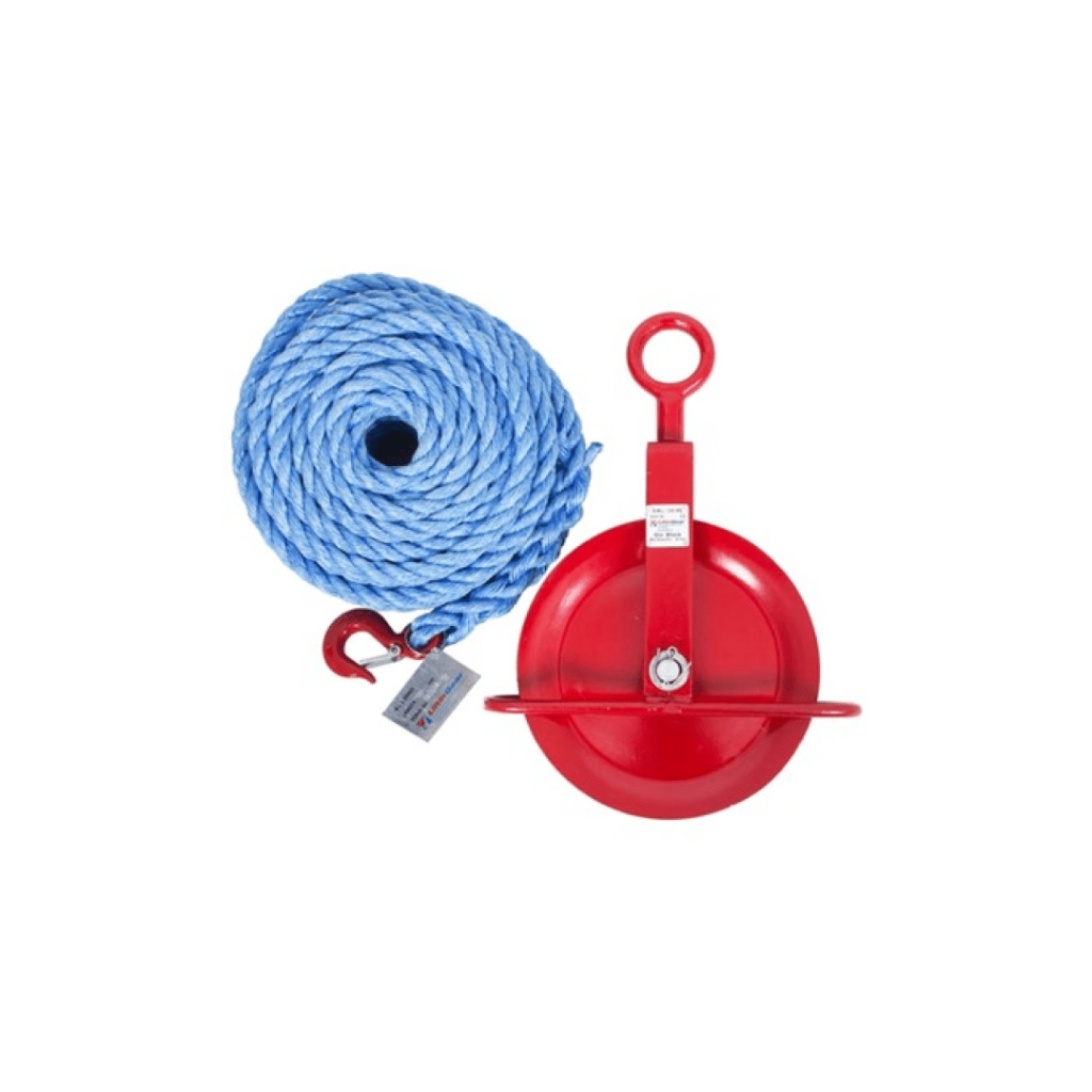 Gin wheel pulley used to assist loading of supplies and equipments onto scaffolding.
